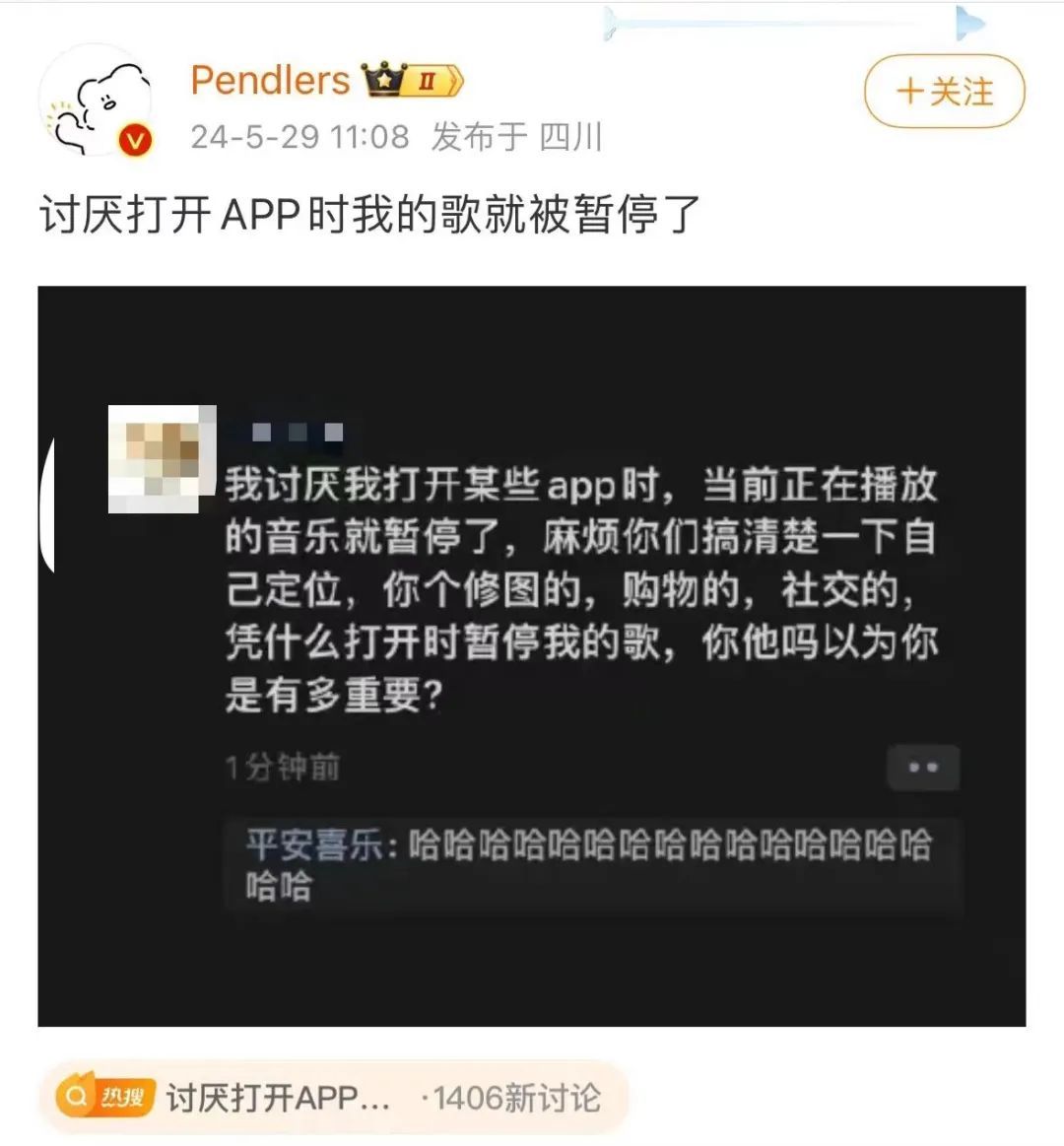 会跳转广告也就算了,还有用户吃着火锅,听着歌打开一个App,“啪!音源被劫了。”