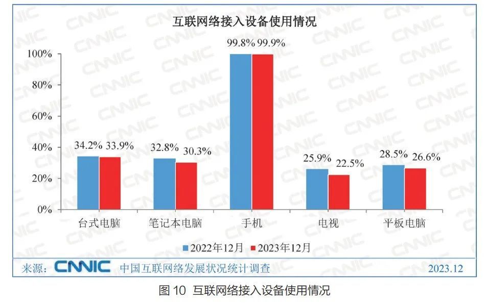 我国网民使用手机上网的比例达99.9%;使用台式电脑和笔记本电脑比例分别为33.9%、30.3%。